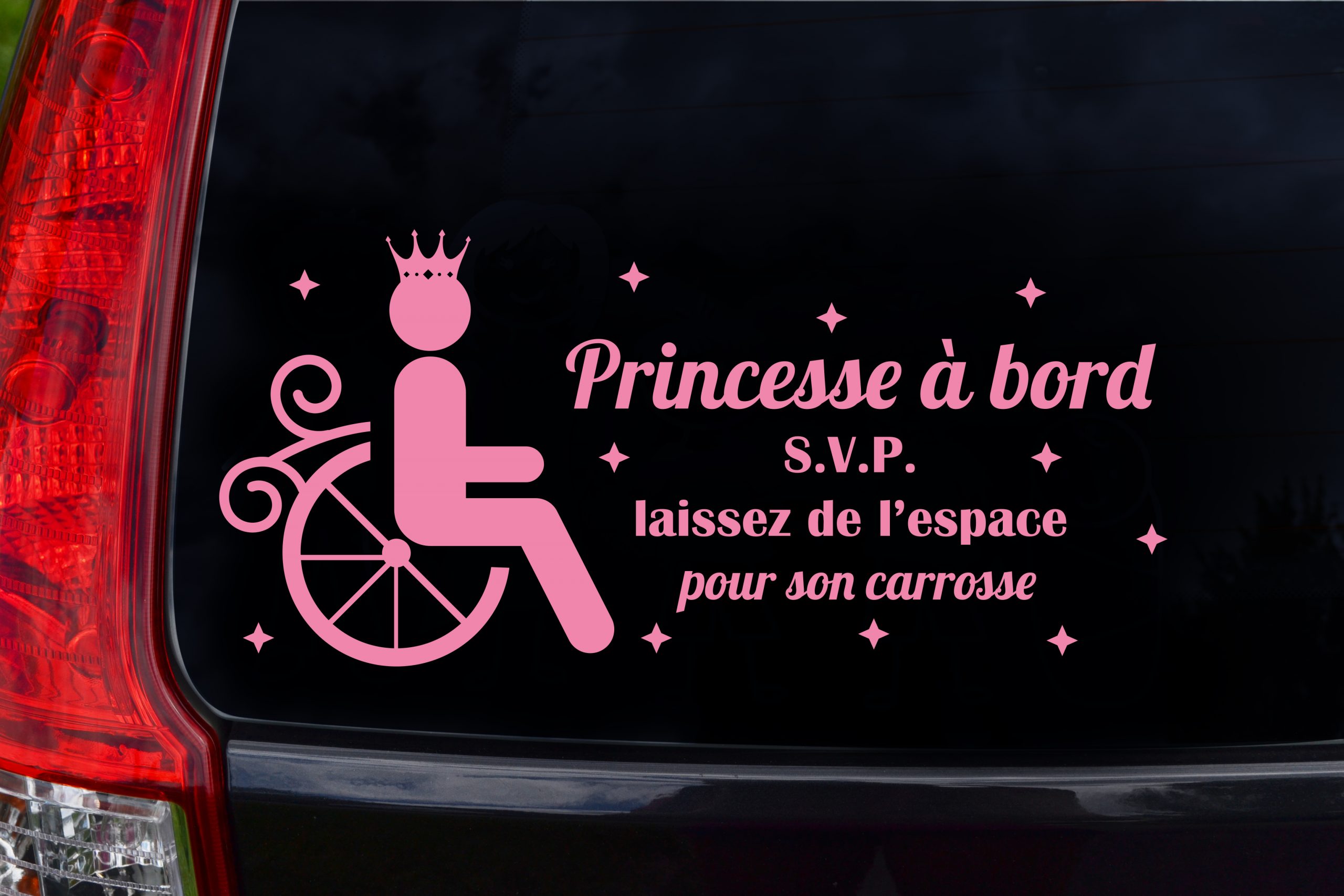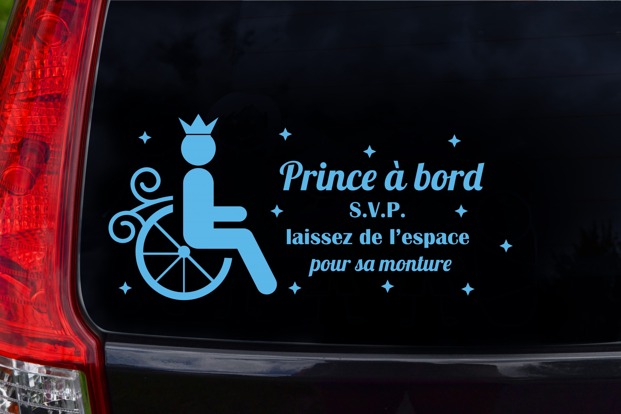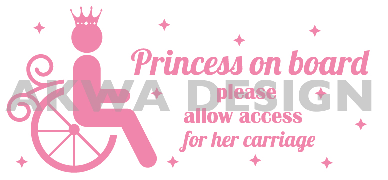 Autocollant pour voiture « princesse à bord s.v.p. laissez de l’espace pour son carrosse » ou « prince à bord laissez de l’espace pour sa monture » pour les enfants handicapés qui ont besoin d’espace à côté de la voiture pour ainsi pouvoir sortir leurs fauteuils roulants.