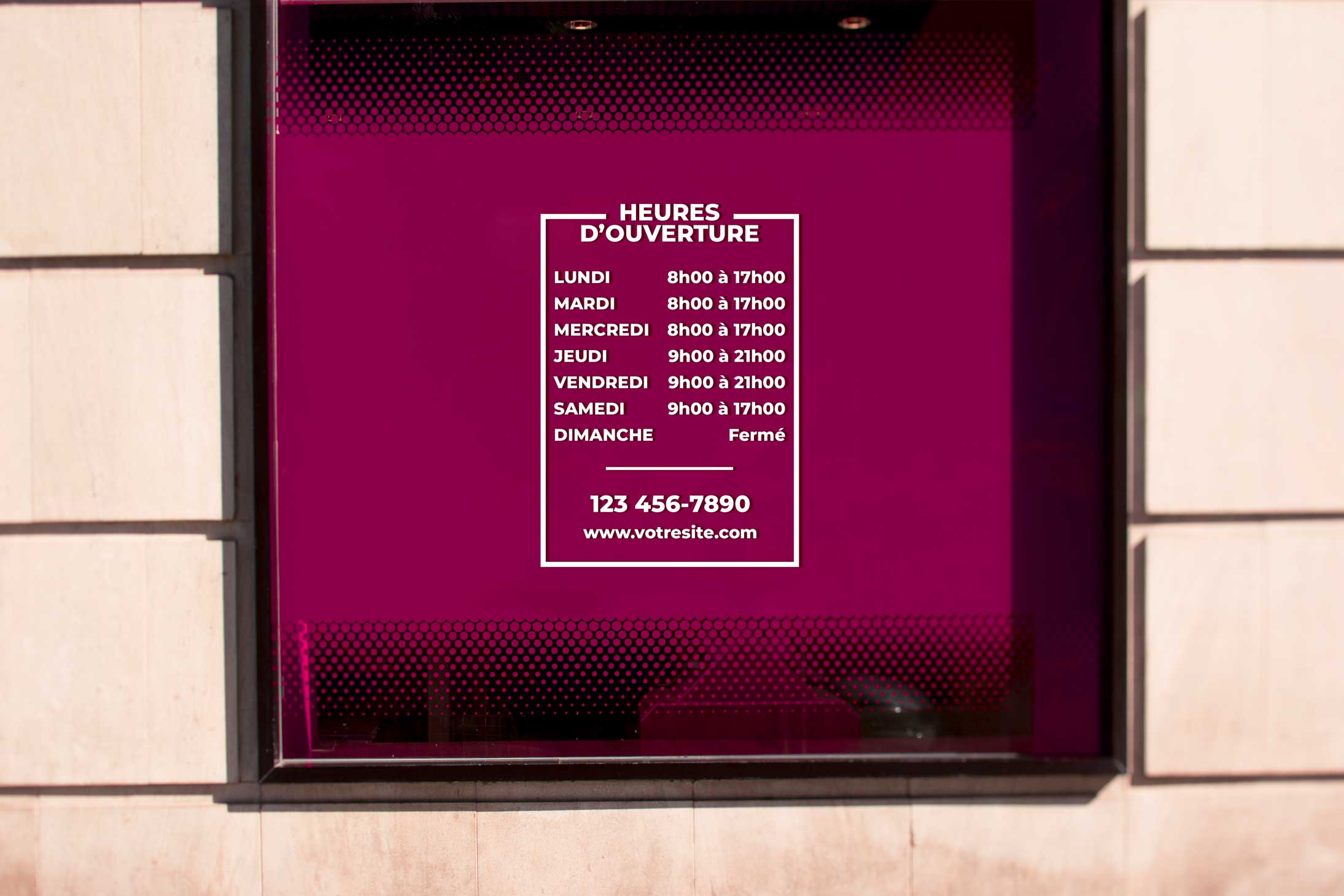 Ce sticker est entièrement personnalisable pour que vous puissiez y ajouter vos propres horaires. Facile à appliquer et à retirer sans laisser de résidu, il offre une solution idéale pour les magasins, les salons de coiffure, les restaurants, et autres commerces de proximité souhaitant afficher leurs horaires de manière claire et élégante.