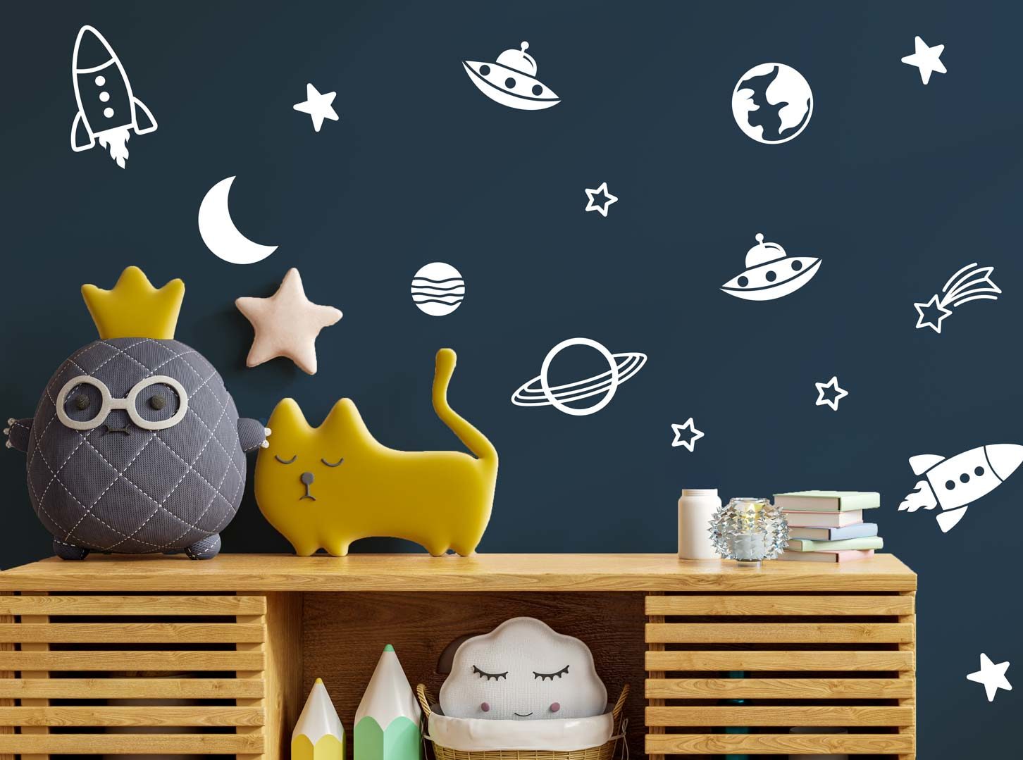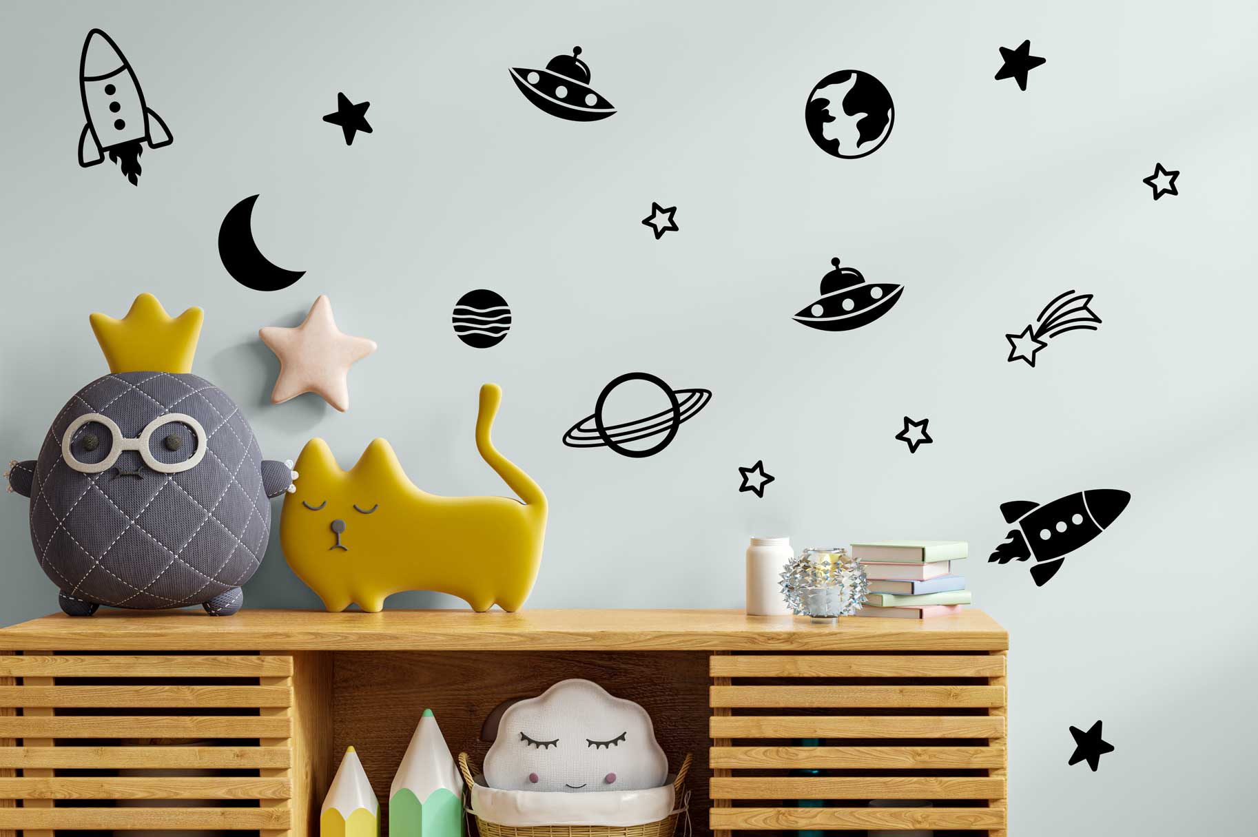 Grâce à ces autocollants muraux sur le thème de l’espace en formes de planètes, d’étoiles et de fusées, vous pourrez décorez facilement la chambre de votre enfant ou de votre bébé pour lui apporter une petite touche unique en laissant place à votre imagination lors du positionnement des autocollants. Les autocollants sont fabriqués à l’aide de vinyle de qualité destiné à un usage intérieur. Ils sont faciles à installer et n’endommageront pas les murs lors de leur retrait. Ils sont aussi faciles d’entretien. Vous n’avez qu’à passer un chiffons humide sur les murs et sur les autocollants pour enlever la poussière et les saletés accumulées.