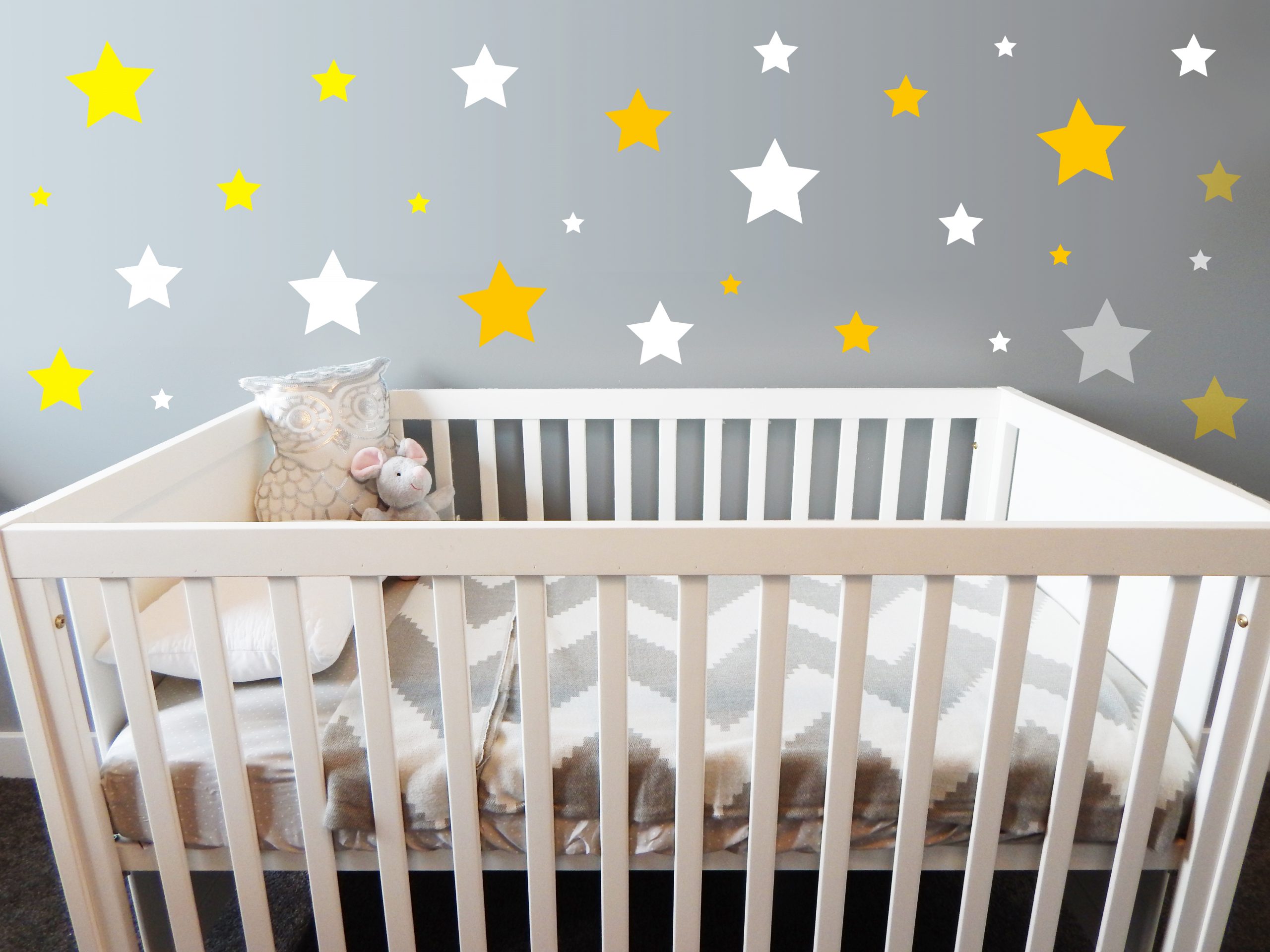 Autocollants muraux étoiles. Grâce à ces 54 autocollants muraux, vous pourrez décorez facilement la chambre de votre enfant ou de votre bébé pour lui apporter une petite touche unique en laissant place à votre imagination lors du positionnement des autocollants. Les autocollants sont fabriqués à l’aide de vinyle, au fini mat, de qualité destiné à un usage intérieur. Ils sont faciles à installer et n’endommageront pas les murs lors de leur retrait. Très faciles d’entretien, vous n’aurrez qu’à passer un chiffons humide sur les murs et sur les autocollants pour enlever la poussière et les saletés accumulées.