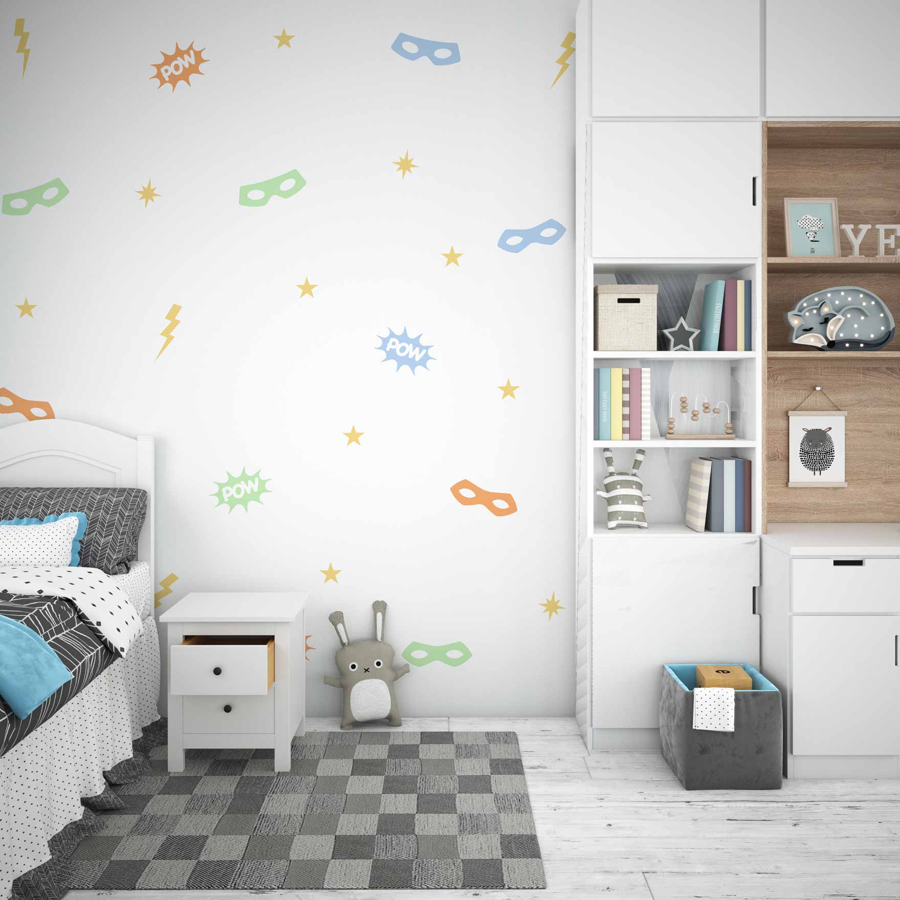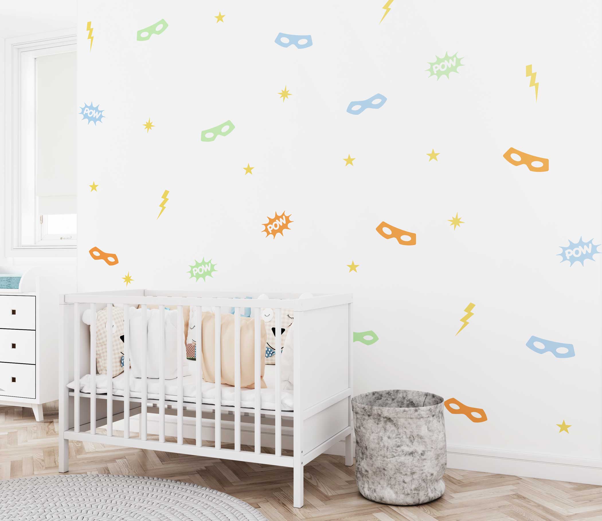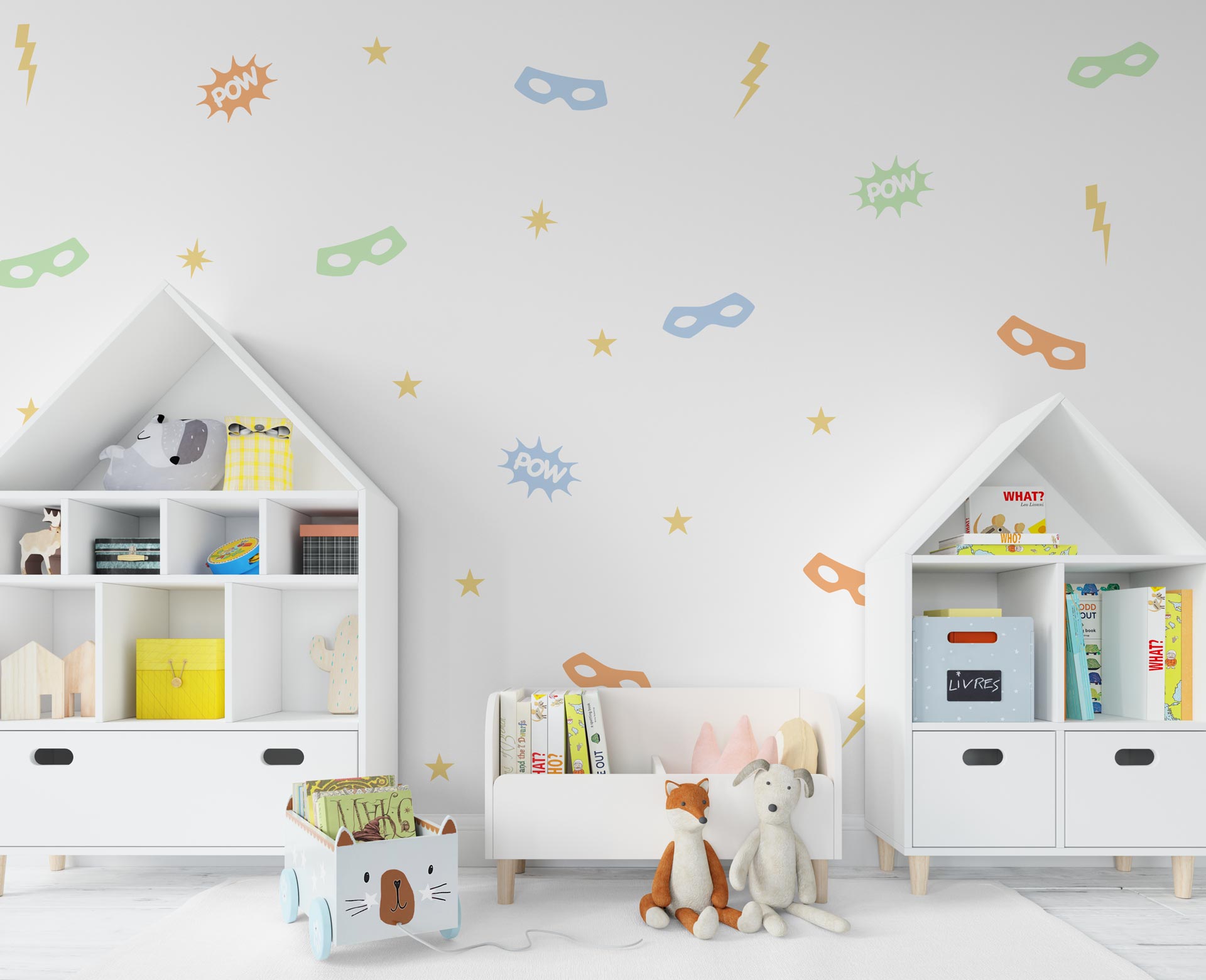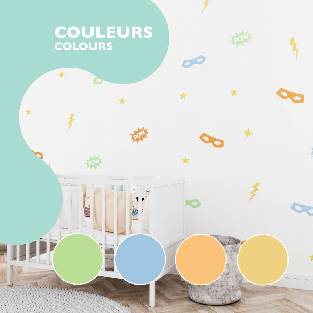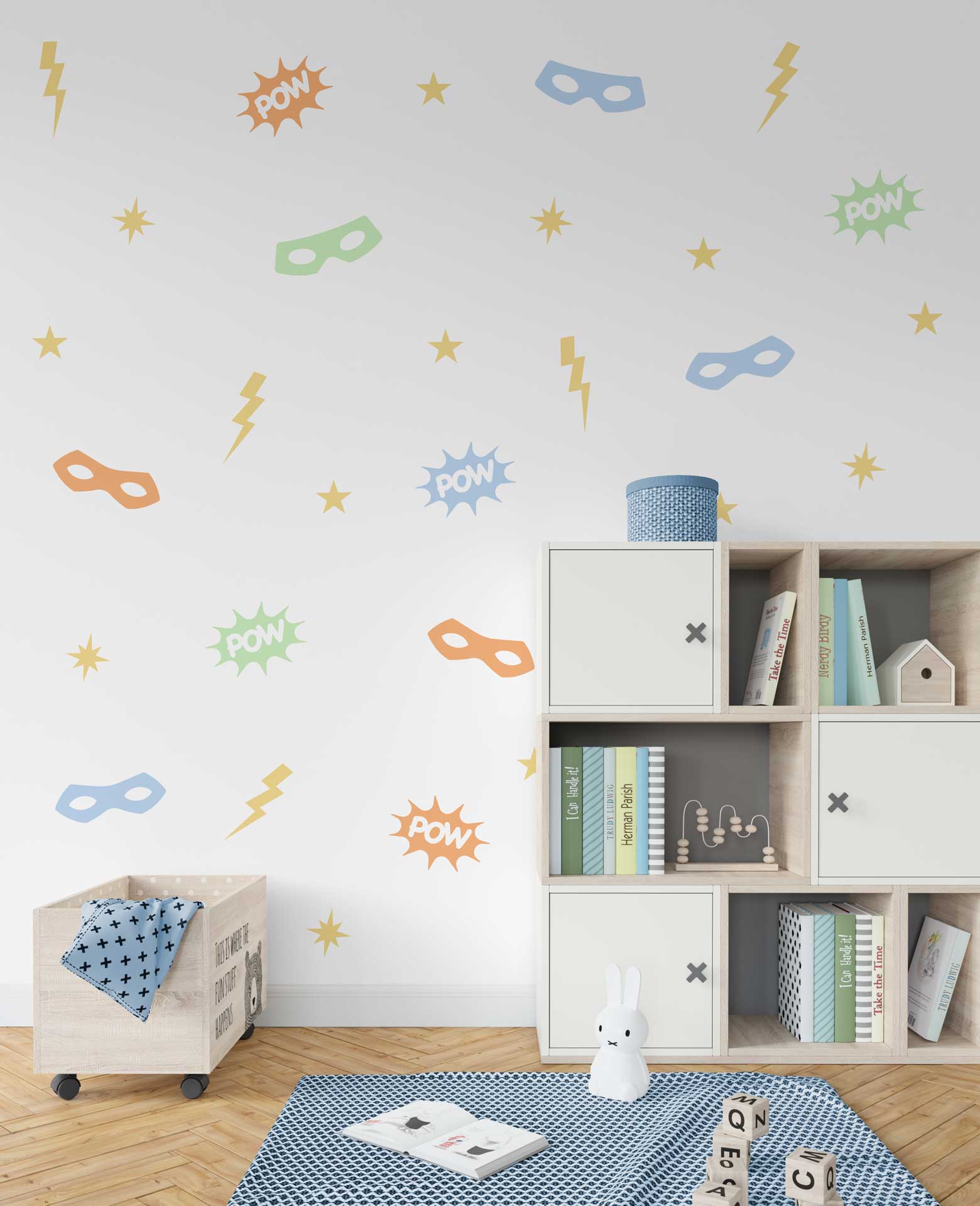 Transformez les murs de leur chambre avec notre ensemble de 39 autocollants super-héros en vinyle, dans des couleurs pastel douces: bleu, orange, jaune et vert. Parfait pour les chambres d’enfants, les salles de jeux, les garderies ou les jardins d’enfants.