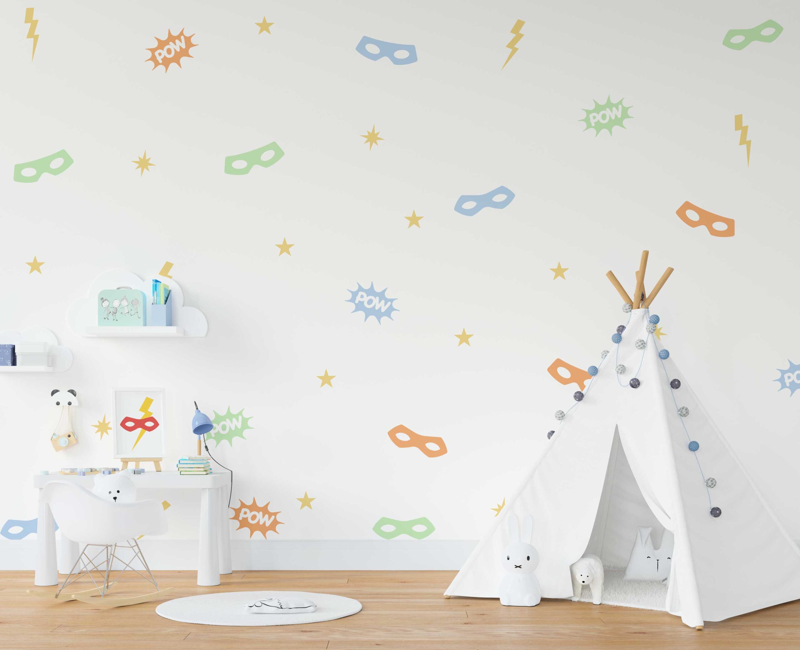 Apportez un univers de super-héros dans la chambre de votre enfant avec ces autocollants muraux en vinyle aux couleurs pastel, parfaits pour décorer une chambre, une salle de jeux ou une garderie.