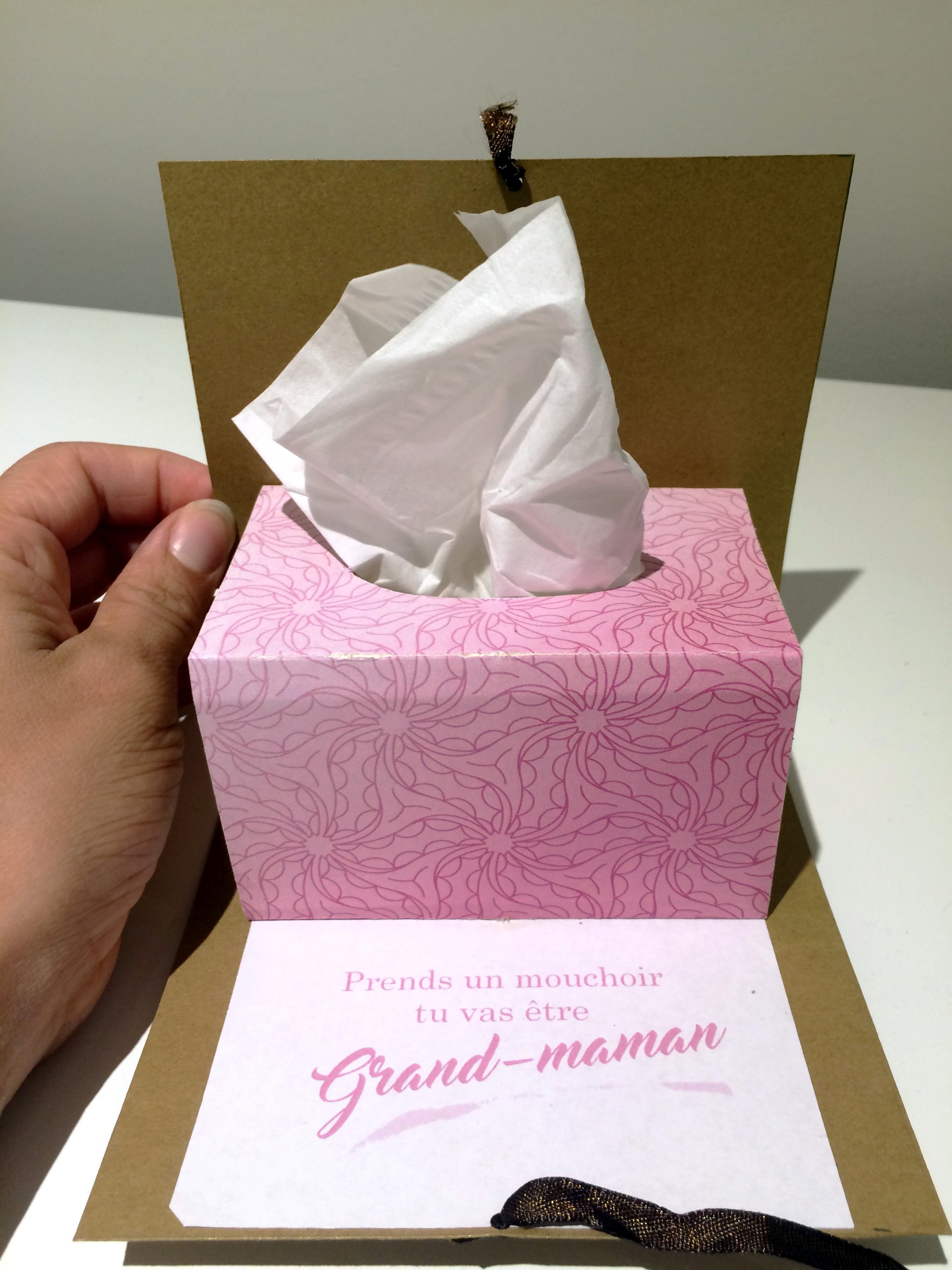 Offrez à vos proches un moment magique avec cette carte pop-up d’annonce de grossesse entièrement faite à la main. À l’ouverture, une petite boîte de mouchoirs se déploie et révèle la belle nouvelle. Une façon tendre et originale d’annoncer l’arrivée d’un bébé.