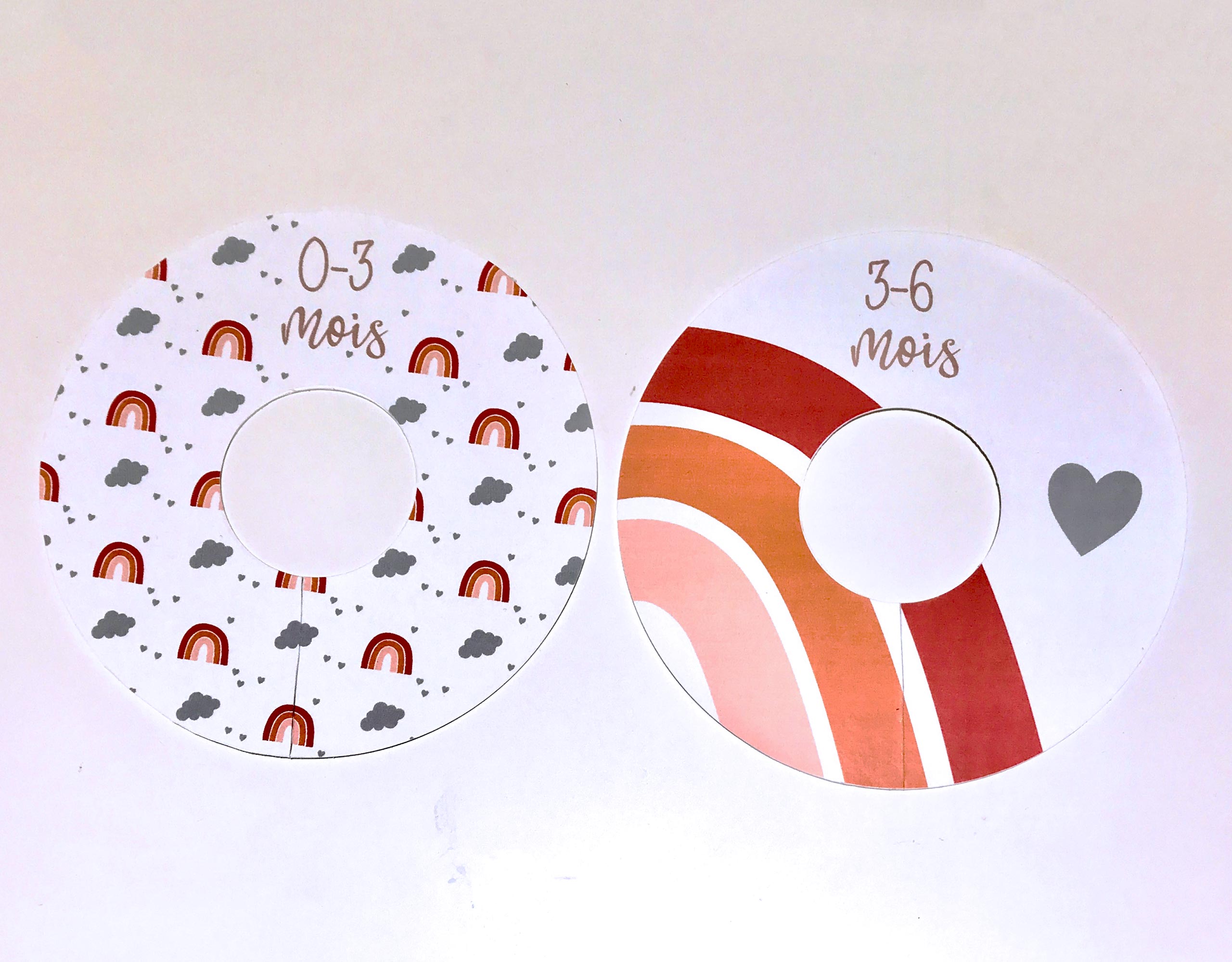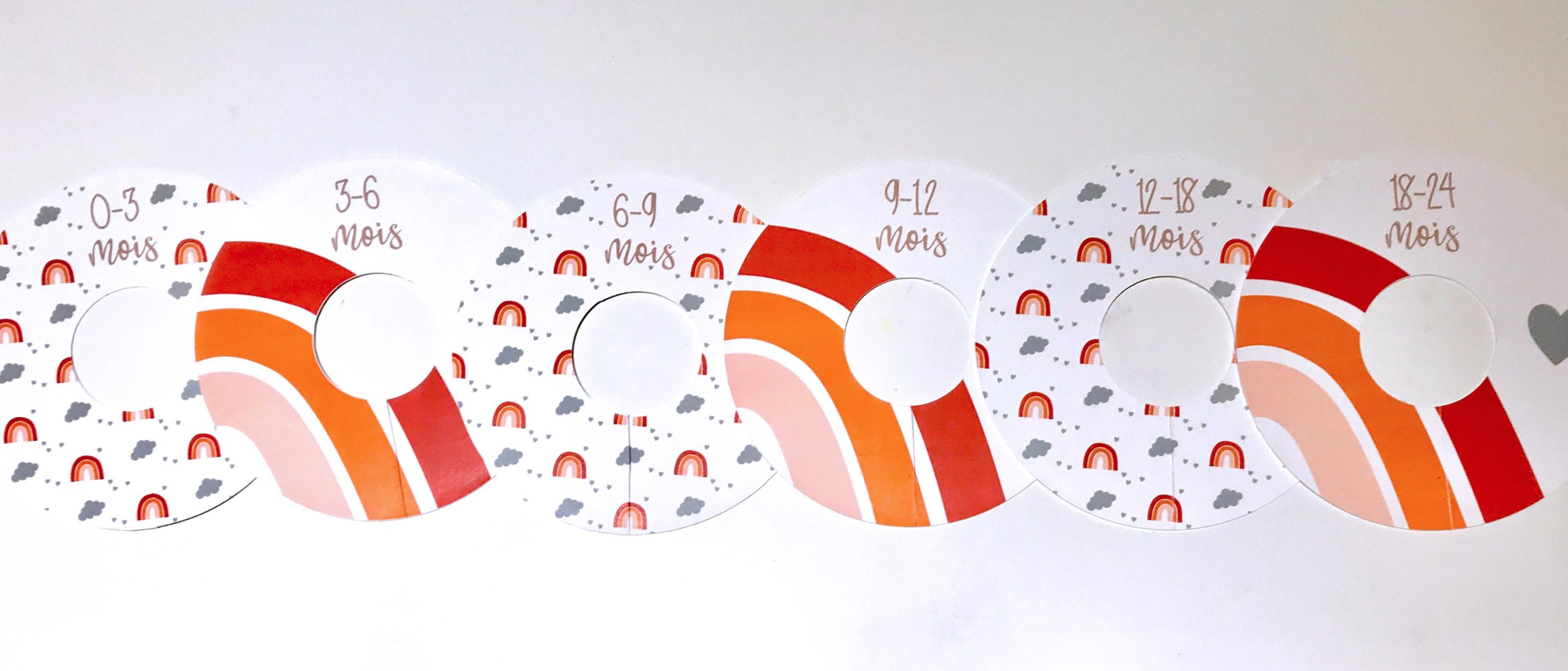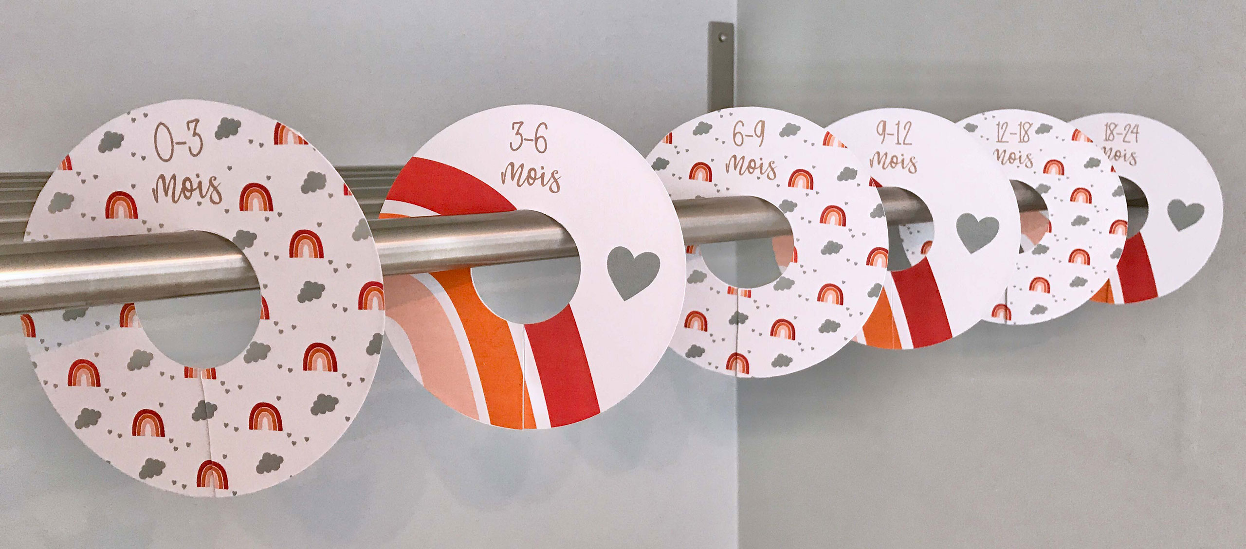 6 séparateurs arc-en-ciel pour penderie de 0 à 24 mois pour organiser la penderie de bébé. Permet de ranger et d’organiser les vêtements selon leurs tailles.