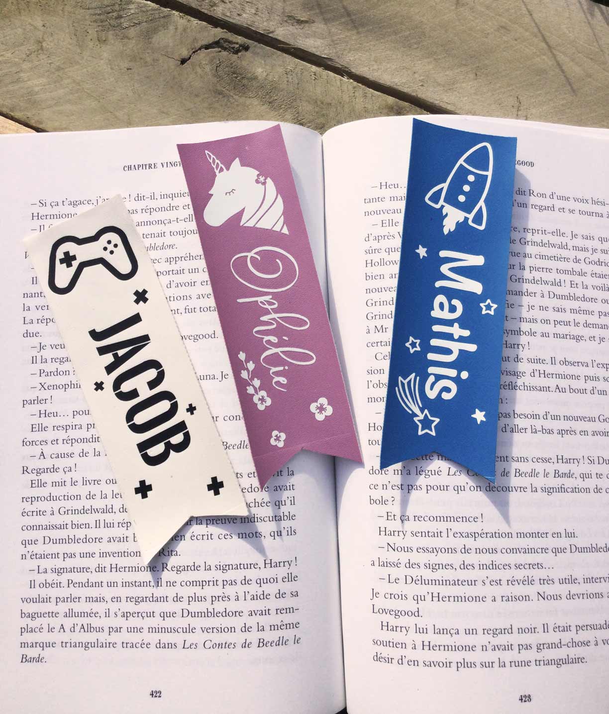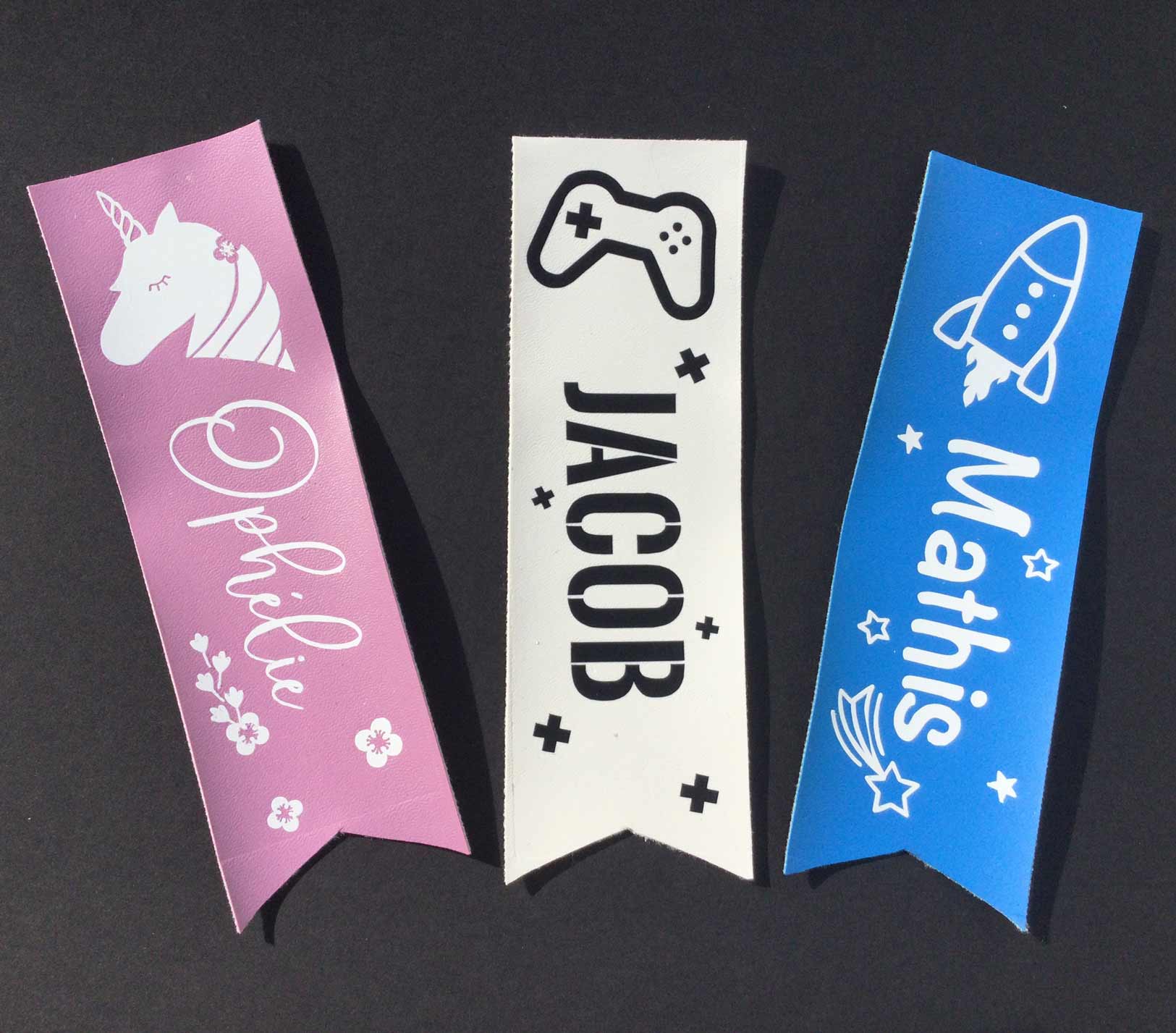 Au moment de passer votre commande faites votre choix entre différentes couleurs de faux cuir et choisissez l’illustration qui convient le plus aux goûts de l’enfant. Le prénom et les images sur les signets sont toujours blancs sauf si vous optez pour le signet de couleur blanc, à ce moment le texte et les images seront noirs.